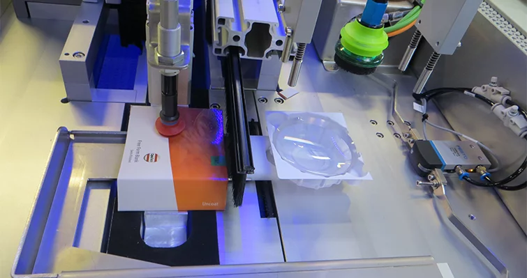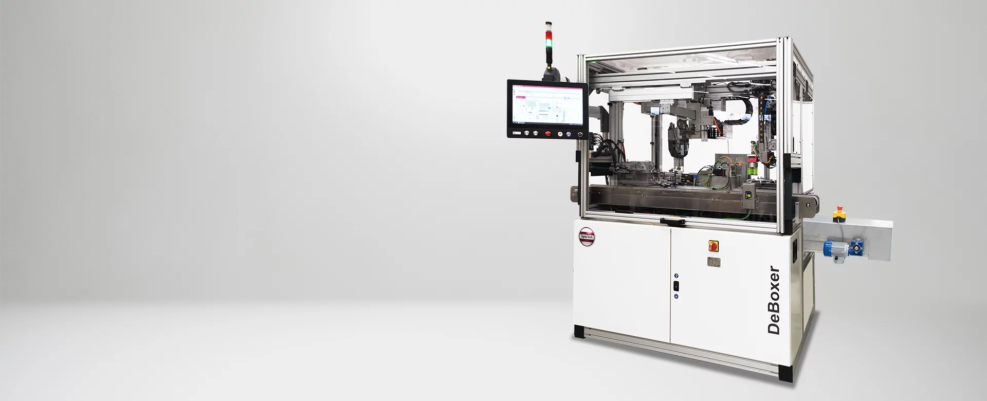 Der neue automatische DeBoxer wurde speziell zum Auspacken halbfertiger Linsen entwickelt. Je nach Kartonart kann diese Maschine bis zu 300 Gläser/h auspacken. Darüber hinaus kann der DeBoxer optional mit 2 Auslaufbändern zur direkten Abfalltrennung von Karton und Kunststoff ausgestattet werden.